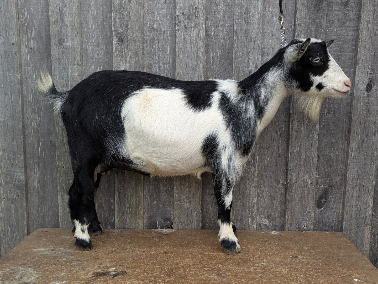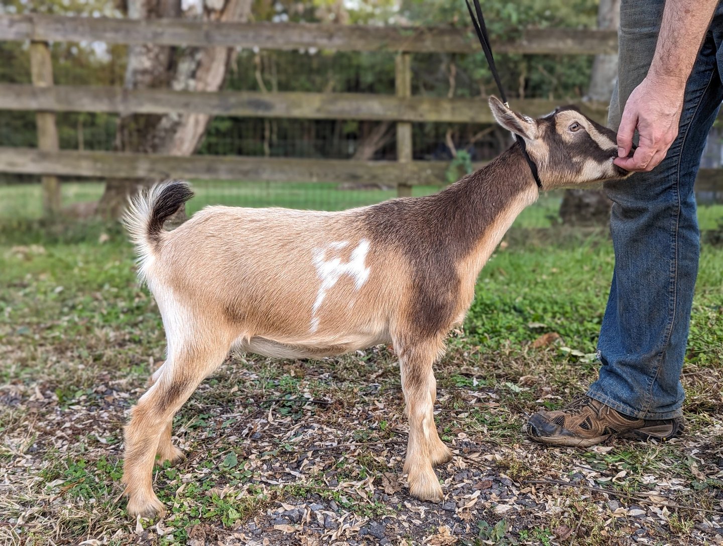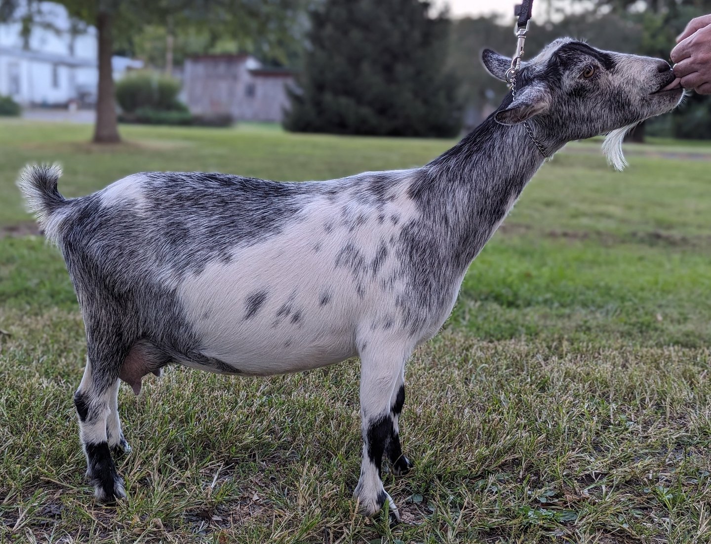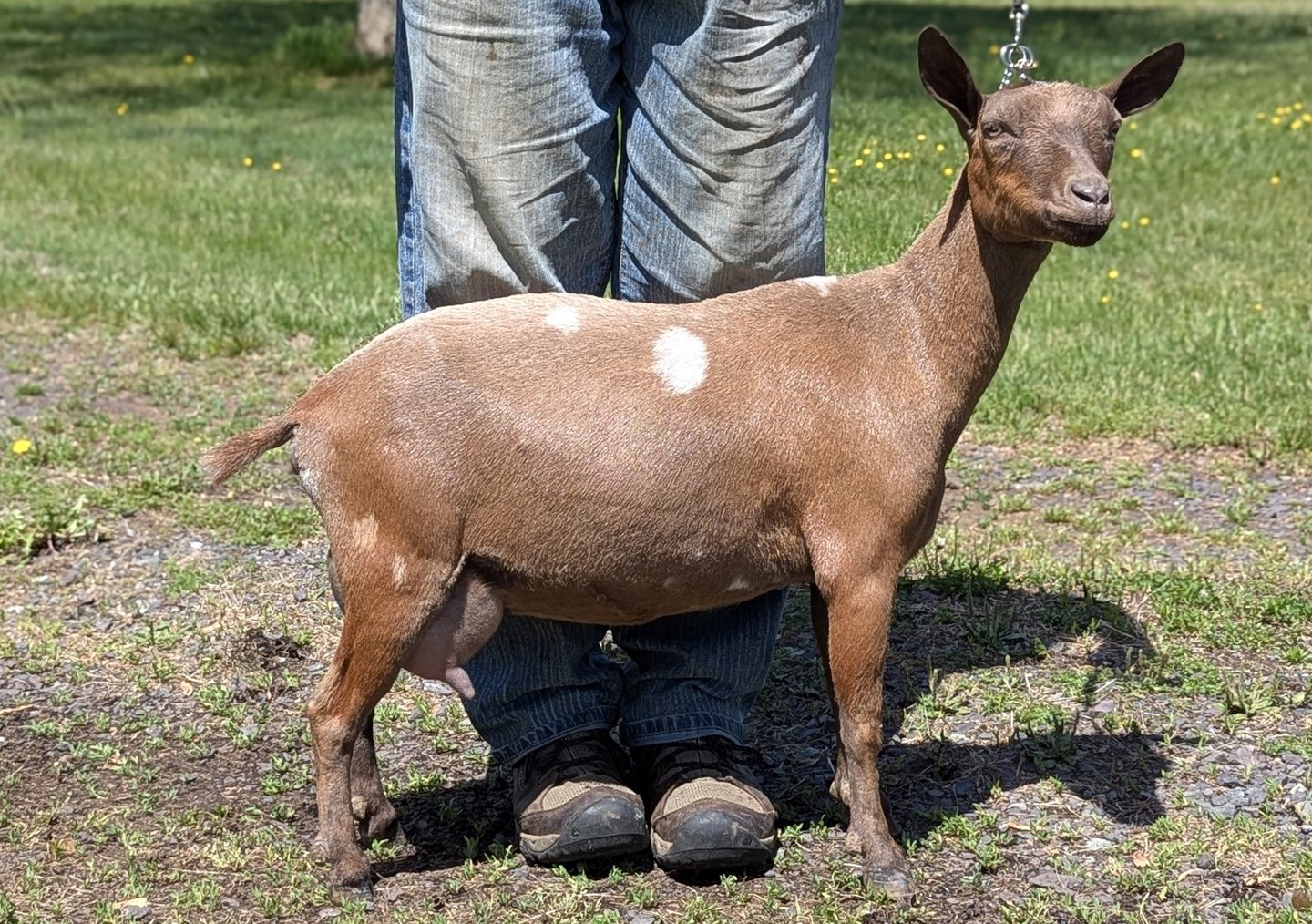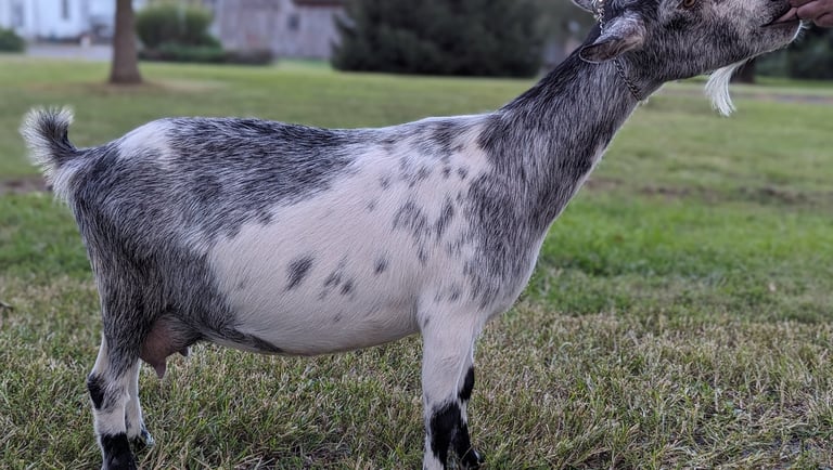 She has a very long dairy body, very dairy neck, and good teat orifices. She gave us triplets as a FF and quads this year. She was recently dried off. She's a lovely girl and enjoys your attention.