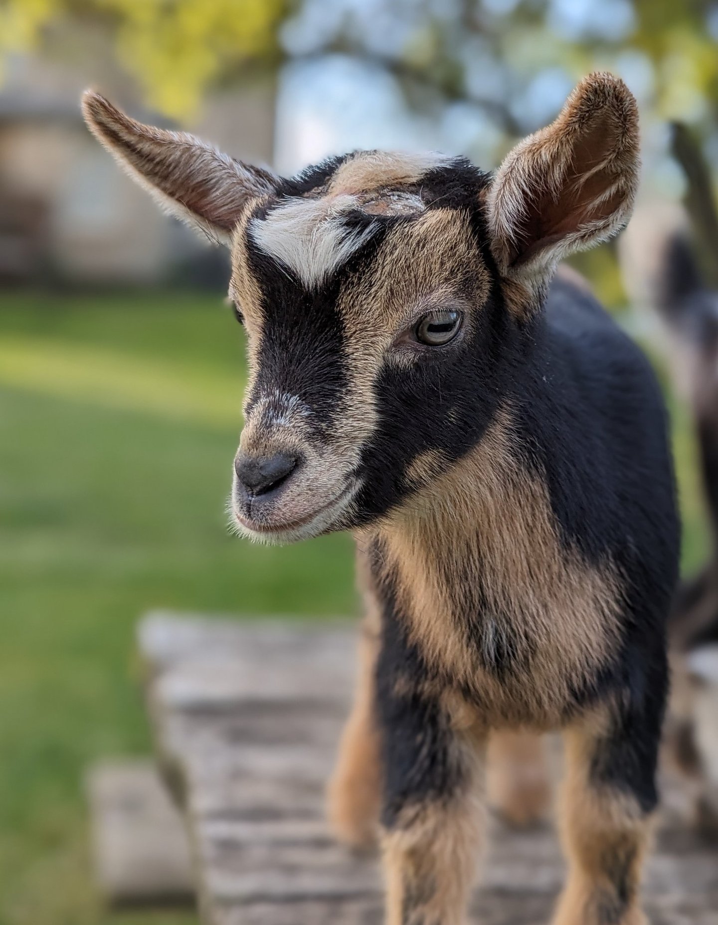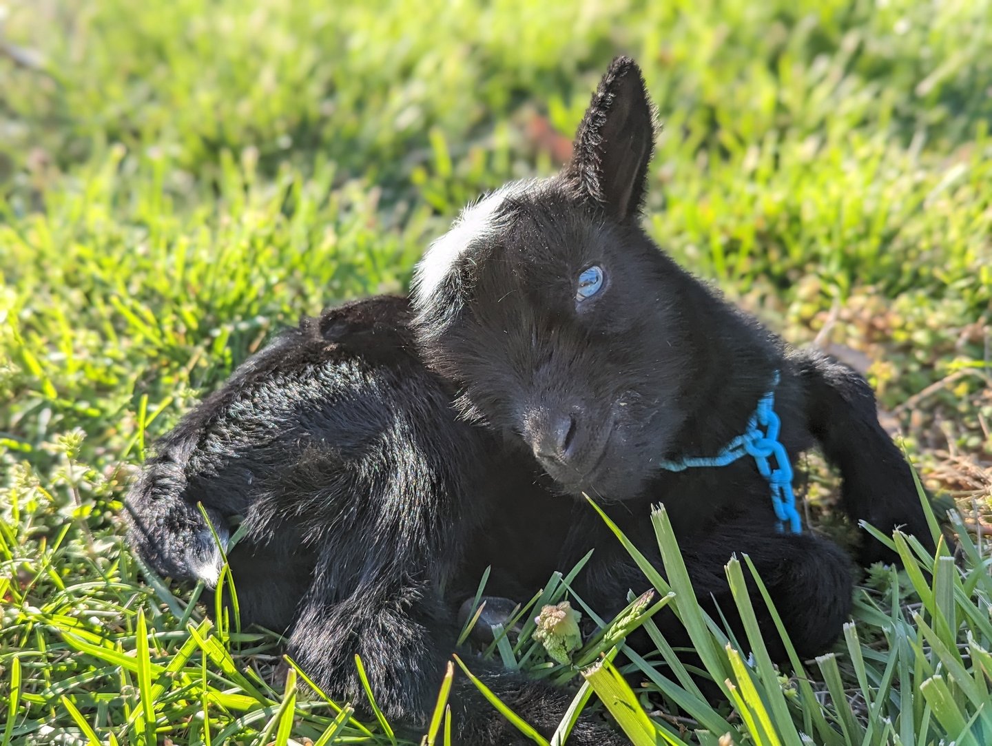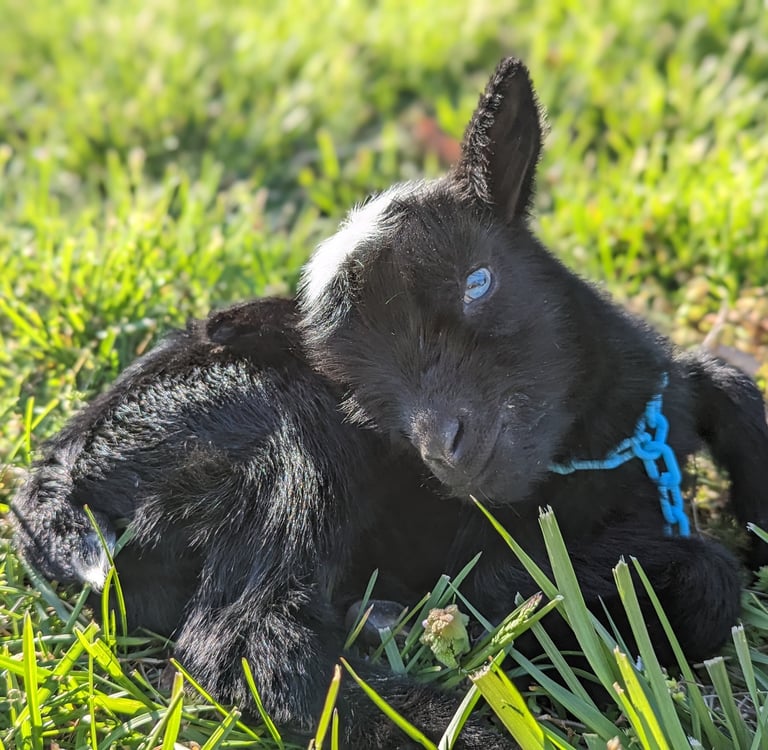 Description: Jiminy is so sweet and is remarkably people-oriented, even for a goat! He has wanted to be with people since day one and will climb right into your lap and make himself at home! When he was smaller, he wouldn't even wait for us to open the gate - he would just pop right through the fencing and run up to us to say "hello!" His vivid blue eyes and white poll stand out beautifully against his shiny, jet-black coat. He will just steal your heart!