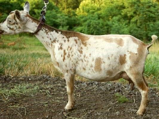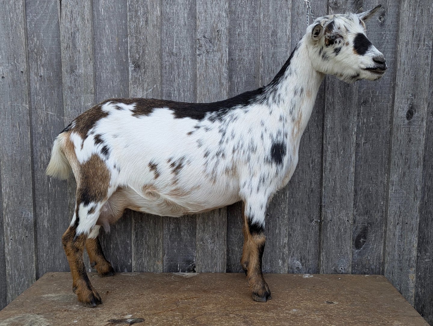 She has a solid body, dairy neck, soft udder with nice orifices, and behaves great on the milk stand. She has always given us beautifully marked quads or triplets. Jazzie definitely knows her name!