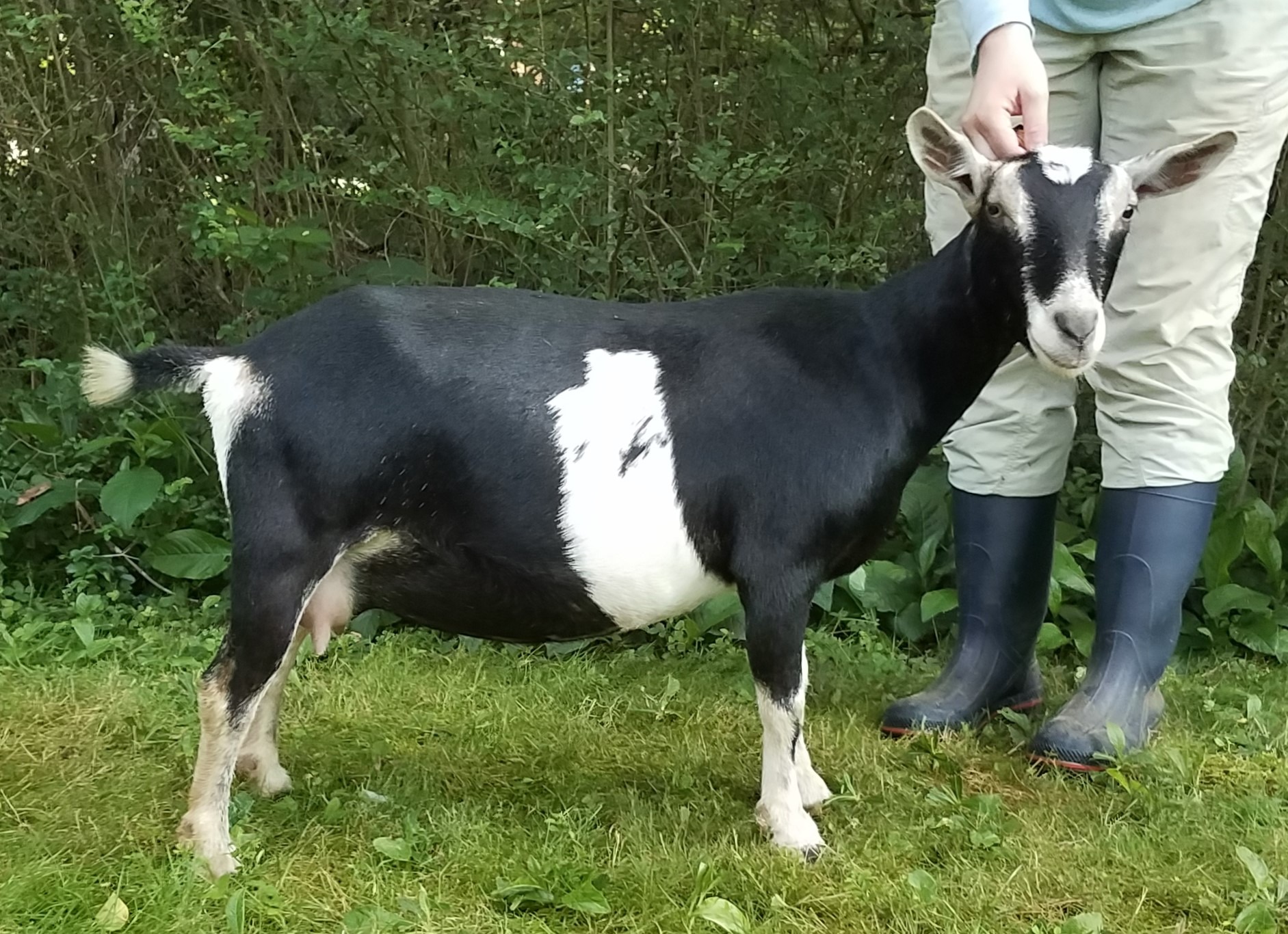She has a long body, very dairy neck, soft udder with nice orifices, and behaves great on the milk stand. She has always given us beautifully marked quads or triplets with unassisted births. Rocket knows her name and loves her cookies!