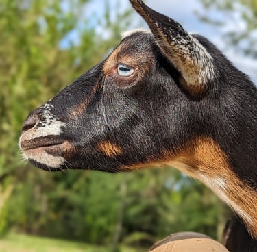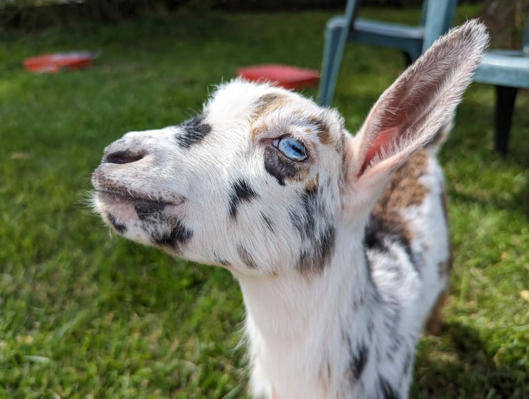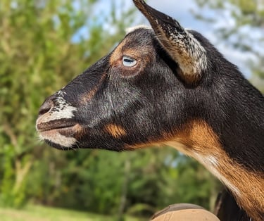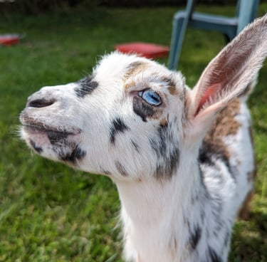 Indie is named for the intense blue eyes she had as a baby. She is a 2023 yearling doe and inherited both her sire's super sweet disposition and her dam's hand milking udder. Indie freshened 4-6-24 with quads! she has become my favorite doe to milk - Her udder is so soft and has wonderful orifices for hand milking as a FF. excited to see how she looks at 2F in 2025!